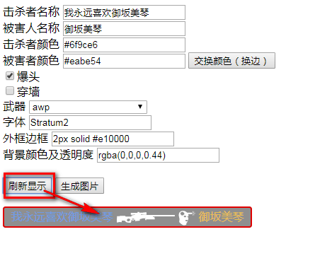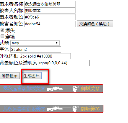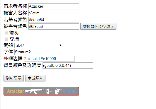 CSGO击杀图标生成器是一款趣味软件,它能够帮助用户做出一些CSGO游戏里的击杀图标,可以自定义击杀方和被击杀方ID,软件基于JS制作,因此是在浏览器上运行,基于Chrome内核的浏览器都能完美运行,欢迎大家下载体验。