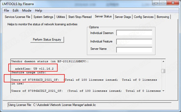 15、点击Server Status标签,点击Perform Status Enquiry,信息结果框如有这句表示成功: adskflex: UP v11.16.2如有这句则表示功能已经激活:Users of 87048MAYALT_2021_0F(在最下面):;