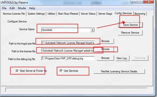 12、启动桌面上生成LMTOOLS Utility ,点击Config Service标签,添加服务:Service Name:AutodeskPath to the lmgrd.exe file:C:\Autodesk\Network License Manager\lmgrd.exe Path to the license file:C:\Autodesk\Network License Manager\adesk.lic勾选User Services 和 Start Servic at Power UP,然后点Save Service,是否添加点是;