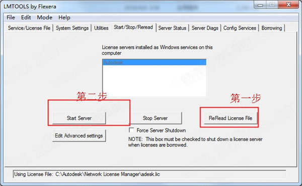 14、点击start/stop/read选项,点击 'rereadlicense file',再点击'start server'启动服务。